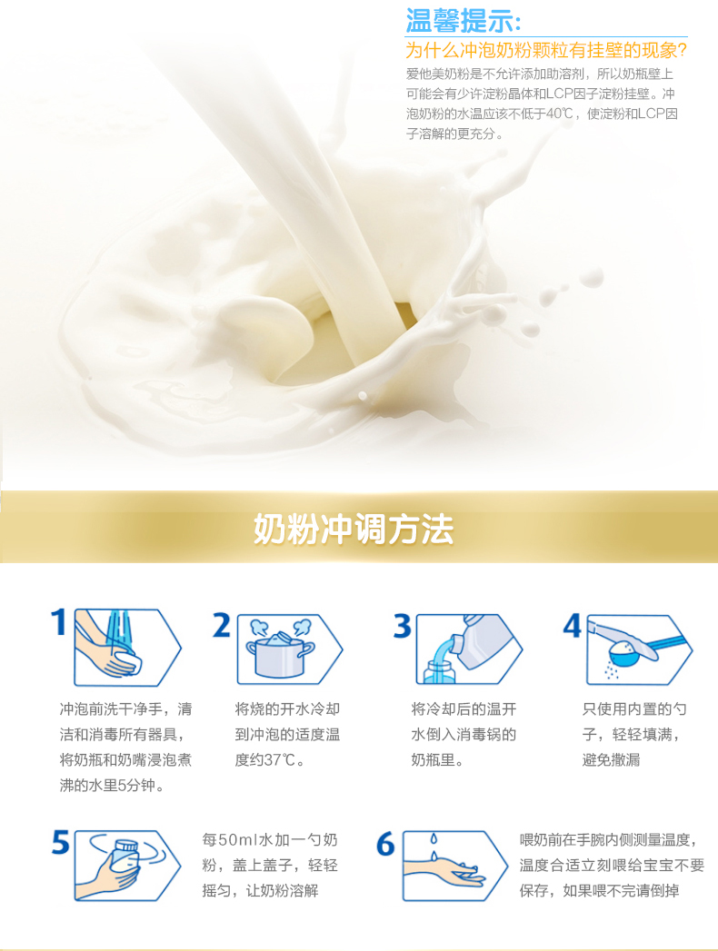 含有比普通牛奶多十倍以上的铁质,并含有丰富维他命C,帮助吸收铁质,同时提供宝宝成长所需的钙质及蛋白质;含有菊粉,帮助肠道有益菌生长,抑制有害细菌,所以对感染导致的腹泻有预防作用。