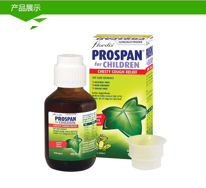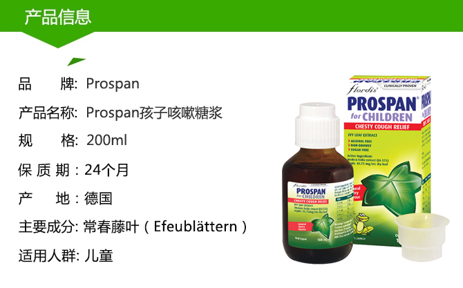 Prospan是植物中提取的纯天然药物,主要成分是常春藤叶(Efeublättern)干提取物 ,该品主要用于支气管炎和慢性呼吸道感染的治疗。这款止咳糖浆是德国幼儿医生经常推荐的一种止咳糖浆。
