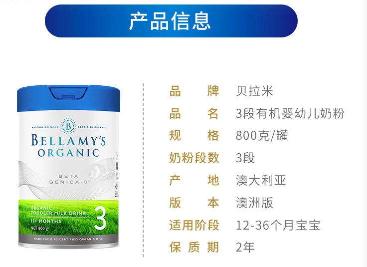 Bellamy's - 贝拉米高端系列白金版有机A2婴儿配方奶粉3段(12-36个月) 800g